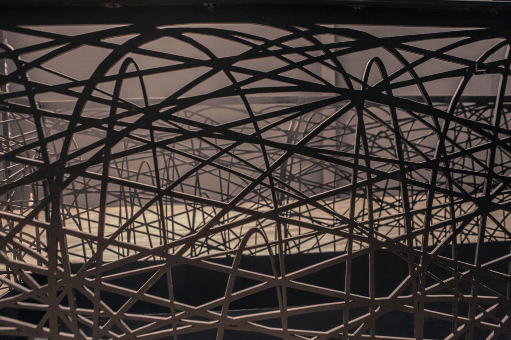 In order not to use random values for the repetition, variation and placement of the six curves, a piece of music as well as an in-house programmed script were used. The parameters of the music notes are translated into the properties and positions of the curves and change according to the dramatics of the music. The resulting pattern is a side-view of the 3-dimensionally arranged curves and has been cut from 8 mm steel using a cnc-machine.